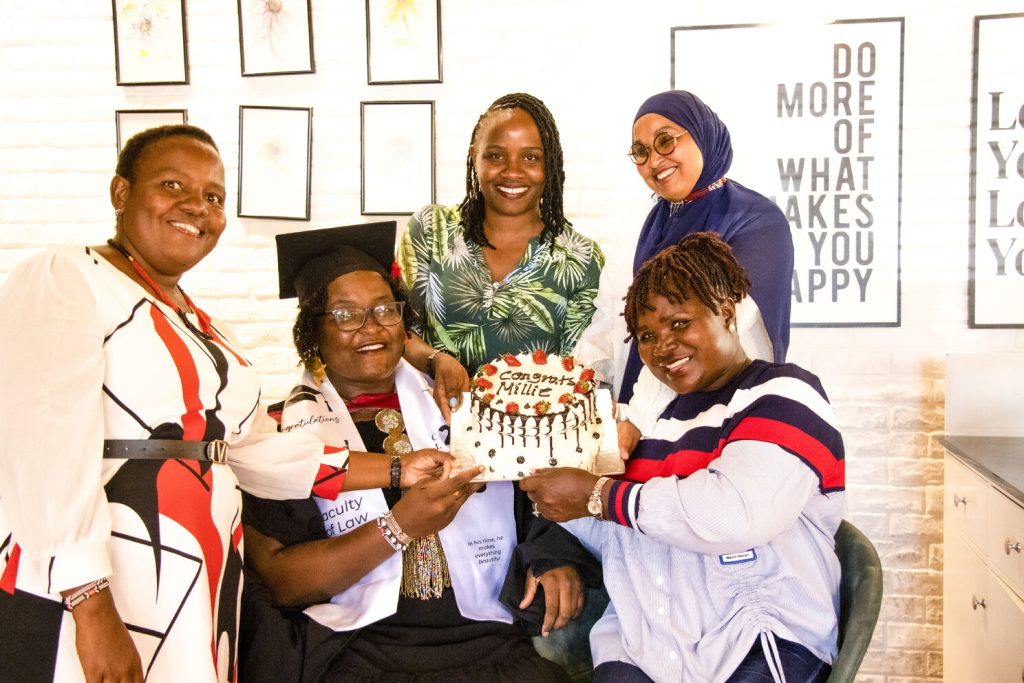 Mildred with her friends celebrating her graduation. They are all wearing beautiful smiles and holding a cake. Photo credit: @Adelaide Khavugwi